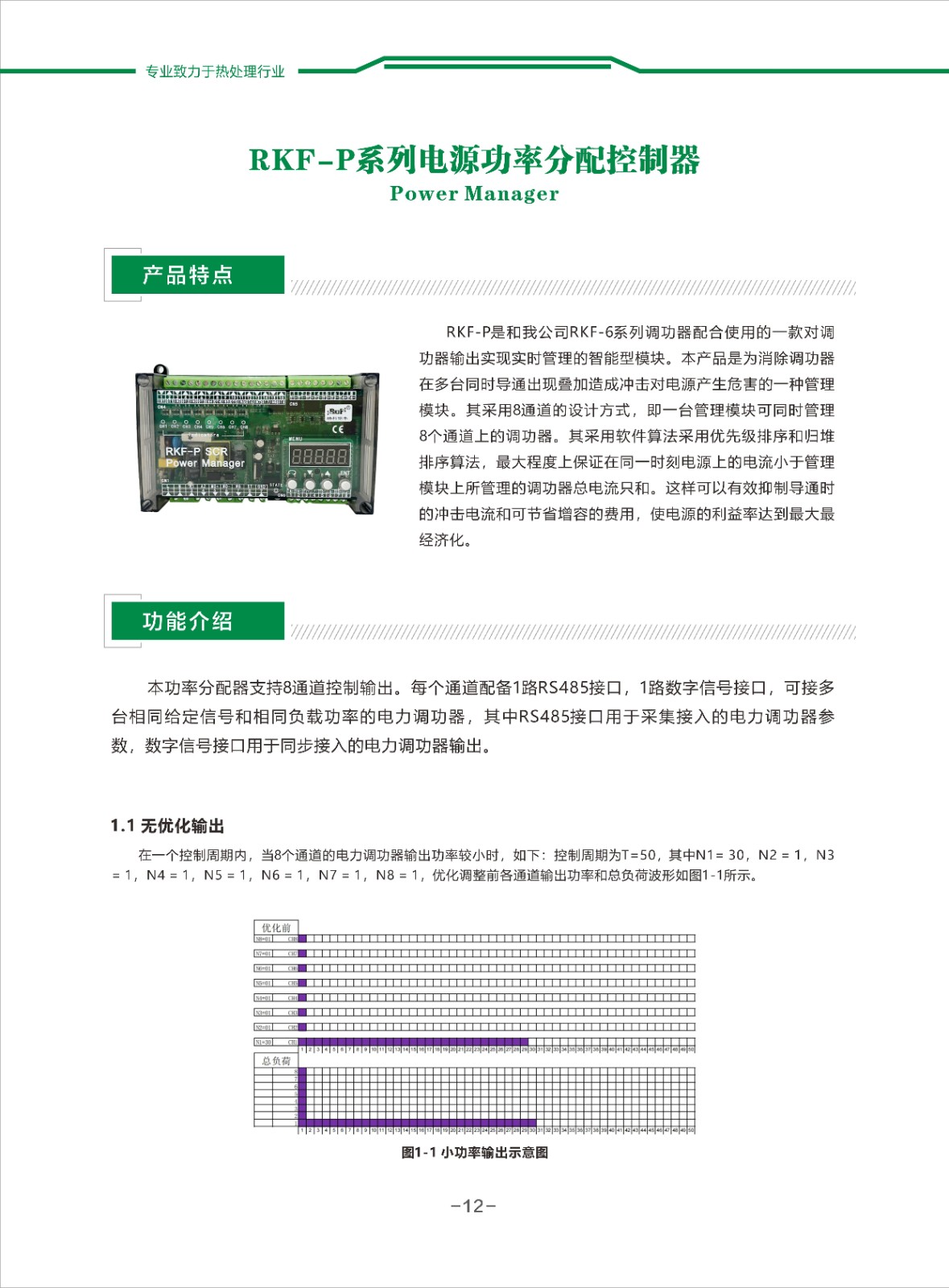 RKF-P是和我公司RKF-6系列調功器配合使用的一款對調功器輸出實現(xiàn)實時管理的智能型模塊。本產品是為消除調功器在多臺同時導通出現(xiàn)疊加造成沖擊對電源產生危害的一種管理模塊。其采用8通道的設計方式,即一臺管理模塊可同時管理8個通道上的調功器。其采用軟件算法采用優(yōu)先級排序和歸堆排序算法,最大程度上保證在同一時刻電源上的電流小于管理模塊上所管理的調功器總電流只和。這樣可以有效抑制導通時的沖擊電流和可節(jié)省增容的費用,使電源的利益率達到最大最經濟化。
